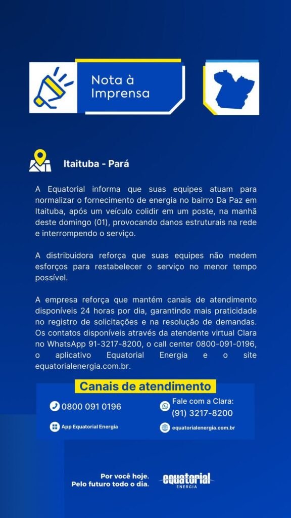 Na madrugada deste domingo (1º), um acidente de trânsito resultou na queda de um poste de energia elétrica, deixando vários bairros de Itaituba, no sudoeste do Pará, sem fornecimento de energia.