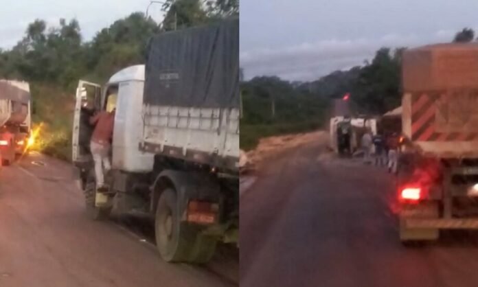 Na tarde da última sexta-feira (06), por volta de 17h30, um acidente foi registrado na BR 163, nas proximidades da comunidade Três Bueiras, no Trairão, sudoeste do Pará. Vídeos gravados no local mostram a parte de trás de uma caçamba virada na estrada.