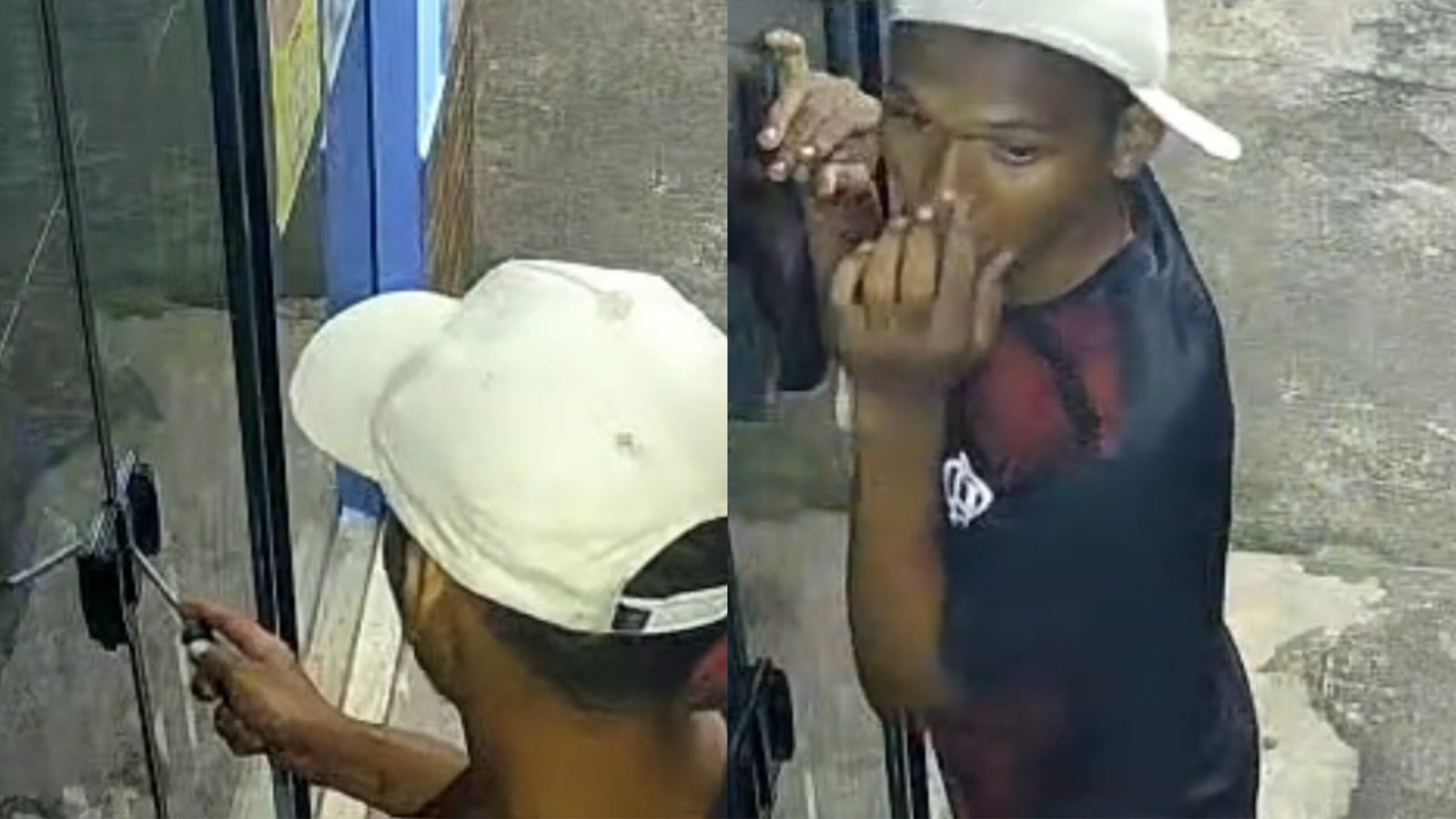 Nas imagens, o suspeito — de pele morena, usando boné branco, camisa do Flamengo, bermuda e sandália — é visto observando o interior do estabelecimento por meio da porta de vidro. Ao perceber que o local estava vazio, ele começou a forçar a entrada com uma chave de fenda.