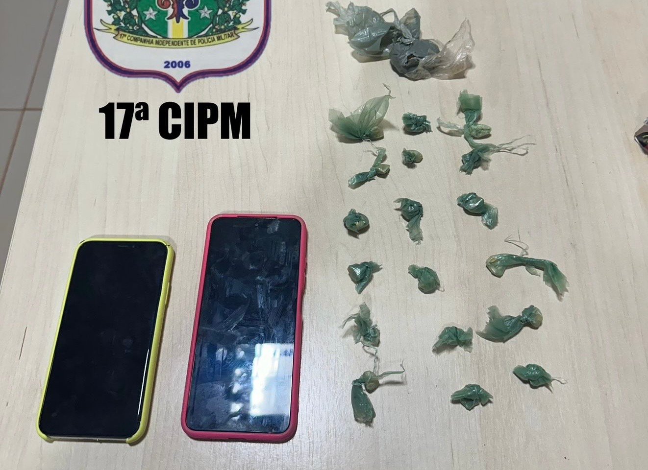 Durante a abordagem, os policiais constataram que ambos já possuíam histórico de envolvimento com o tráfico de drogas no município. Na revista, substâncias entorpecentes foram encontradas escondidas nas roupas de um dos suspeitos, que é menor de idade.