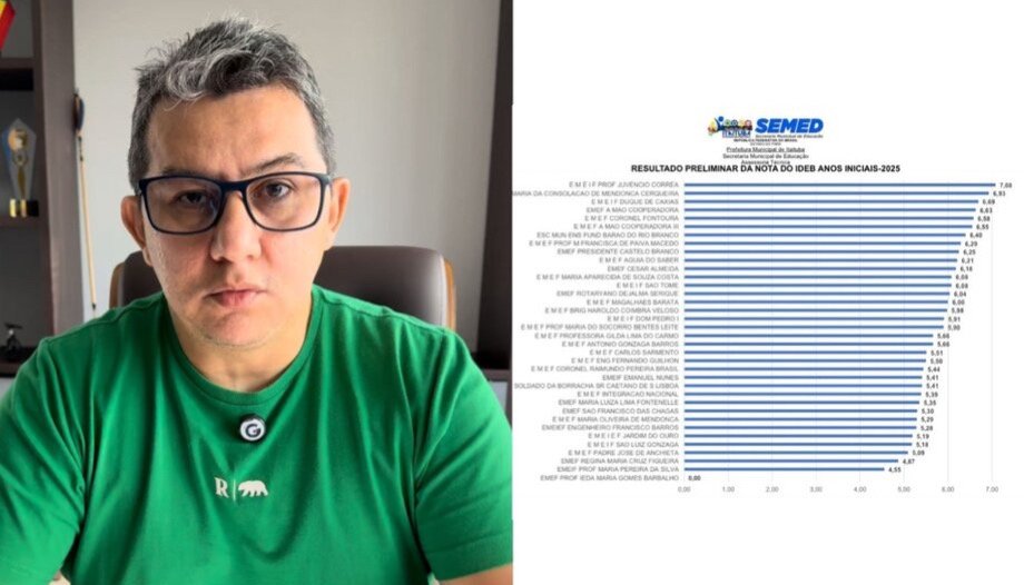 O resultado foi destacado nesta quinta-feira (16) pelo secretário municipal de Educação, Amilton Pinho. Segundo ele, além do desempenho da unidade campeã, outras 15 escolas da rede municipal também superaram a média 6, considerada padrão de excelência pelo Ministério da Educação (MEC).