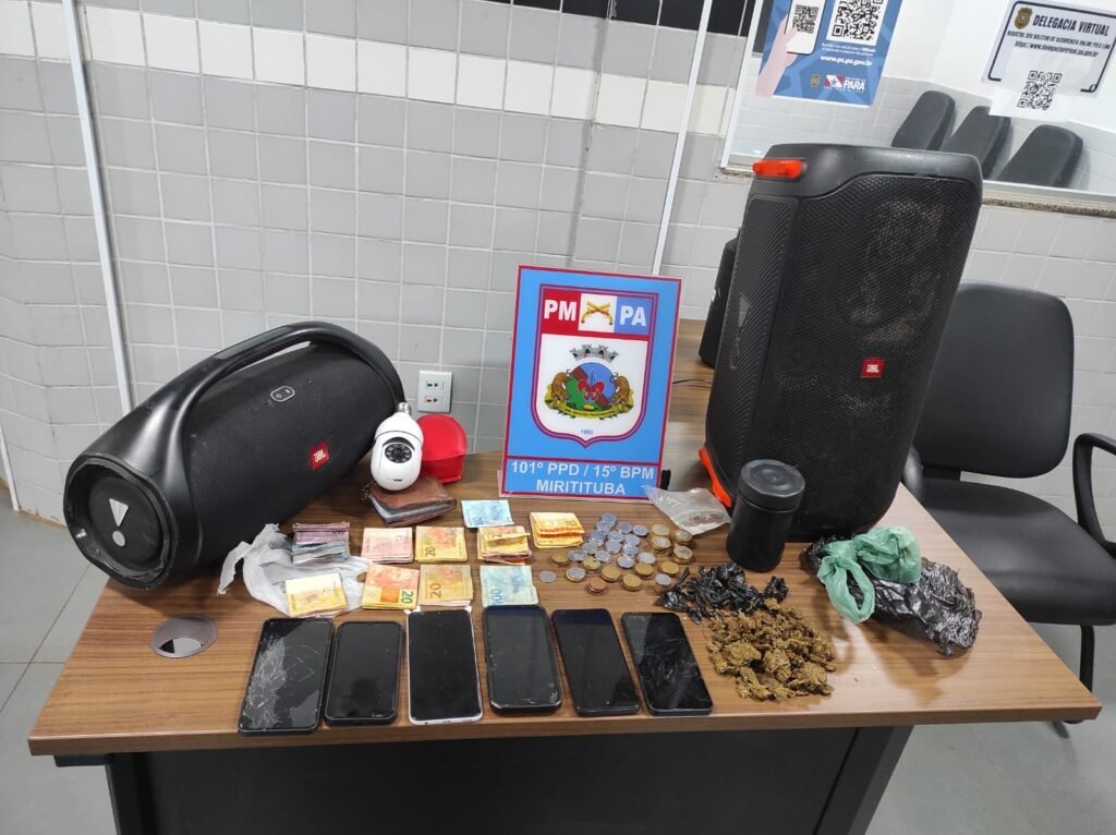 Ao ser questionada, S. S. S. afirmou que o dinheiro era proveniente da venda de drogas. No mesmo cômodo foi encontrada uma bolsa vermelha em formato de coração contendo R$ 59,85 em moedas, além de cinco celulares e duas caixas de som JBL, objetos cuja procedência G. E. G. S. não soube informar. Também foi apreendido o celular da própria suspeita, um iPhone cinza com capa preta.