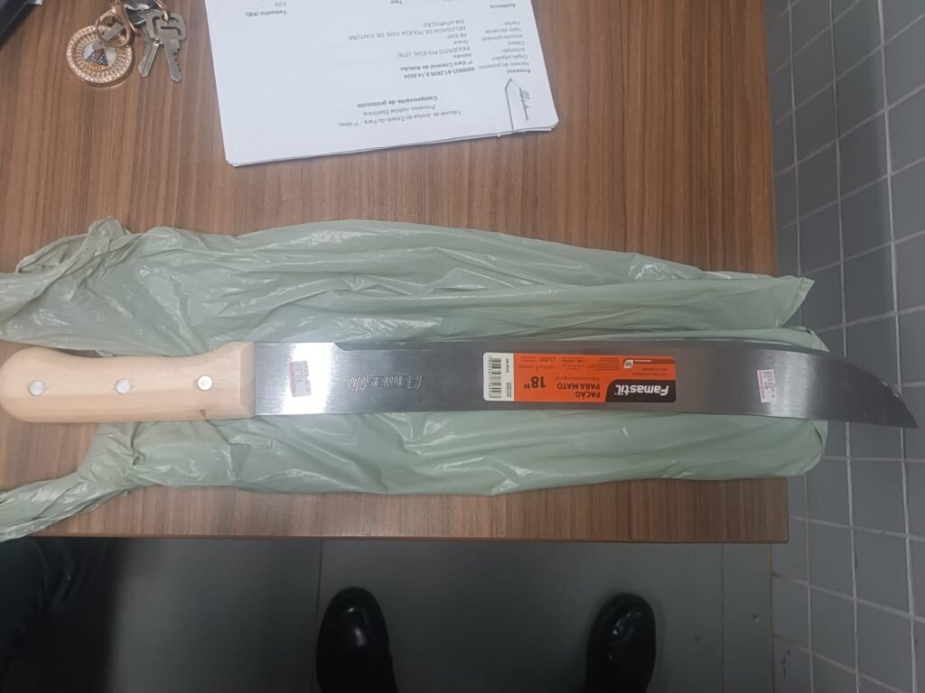 Na busca realizada no interior do automóvel, os policiais encontraram um facão em estado novo, da marca Famastil, com cabo de madeira, guardado dentro de uma sacola e ainda com a etiqueta no valor de R$ 90.
