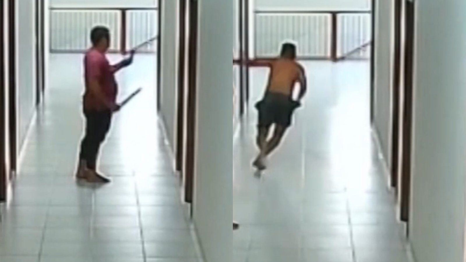 Câmeras de segurança do estabelecimento registraram o momento em que o suspeito se aproxima da porta de um quarto enquanto filma a ação com o celular. Em seguida, ele retira uma faca da bermuda e parte para o ataque. Nas imagens, a vítima aparece saindo do quarto já ferida, tentando fugir ao descer as escadas, enquanto é perseguida pelo agressor.