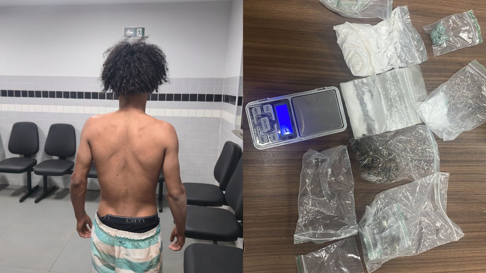 Durante o acompanhamento, o condutor acabou caindo na 1ª Rua, momento em que foi abordado pelos militares. Na revista pessoal, foi encontrada, escondida em suas partes íntimas, uma sacola contendo aproximadamente 28,6 g de substância análoga à maconha, 44,6 g de substância análoga à cocaína e 2,4 g de substância análoga ao crack.