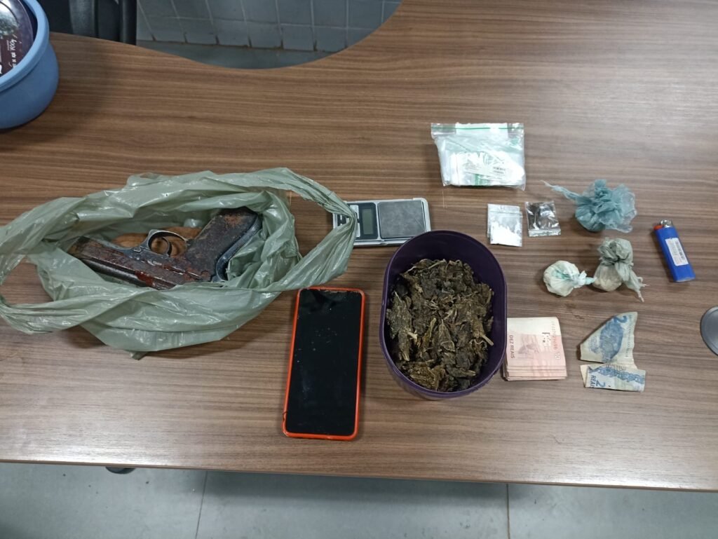 Ocorrência foi registrada na noite desta segunda-feira (8) após denúncia de tráfico de drogas; Polícia Militar apreendeu entorpecentes, dinheiro e uma arma de fogo.