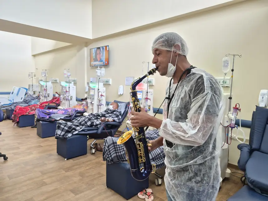 Na quarta-feira (11), pacientes em hemodiálise foram surpreendidos com uma apresentação de música ao vivo, conduzida por um saxofonista do 53º Batalhão de Infantaria de Selva de Itaituba, levando um momento de leveza e acolhimento durante o tratamento.