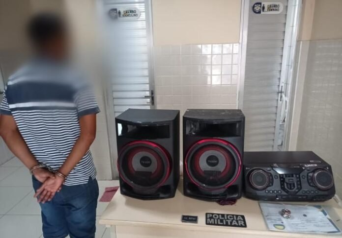 Diante disso, a guarnição realizou a detenção do jovem e, após buscas, conseguiu localizar toda a aparelhagem de som.
