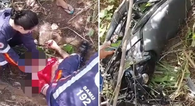 Com o impacto da batida, o jovem identificado como Eric Matheus dos Santos Pereira foi parar fora da pista, em área de vegetação, assim como a motocicleta.