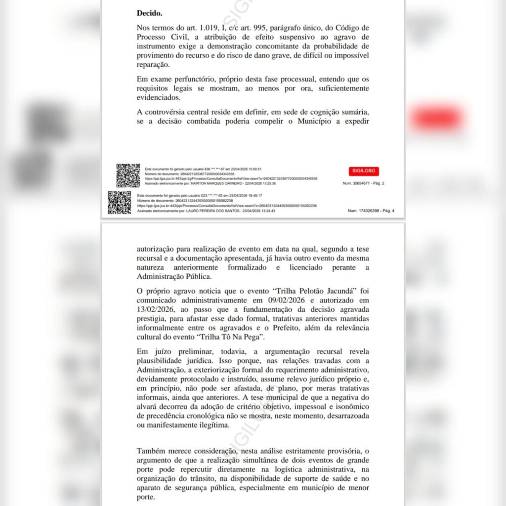 A decisão foi tomada após o Município de Jacundá ingressar com um agravo de instrumento contra uma determinação anterior que obrigava a liberação do evento em até 24 horas, sob pena de multa diária.