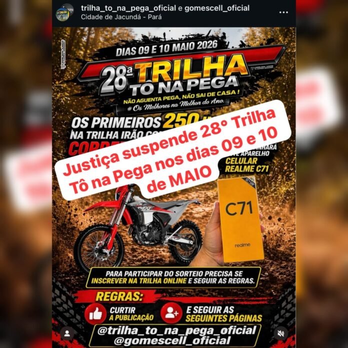 A Justiça decidiu suspender a autorização para a realização da “28ª Trilha Tô Na Pega”, programada para os dias 9 e 10 de maio de 2026, no município de Jacundá, no sudeste do Pará. Com isso, apenas a “Trilha Pelotão Jacundá” permanece autorizada para o período.
