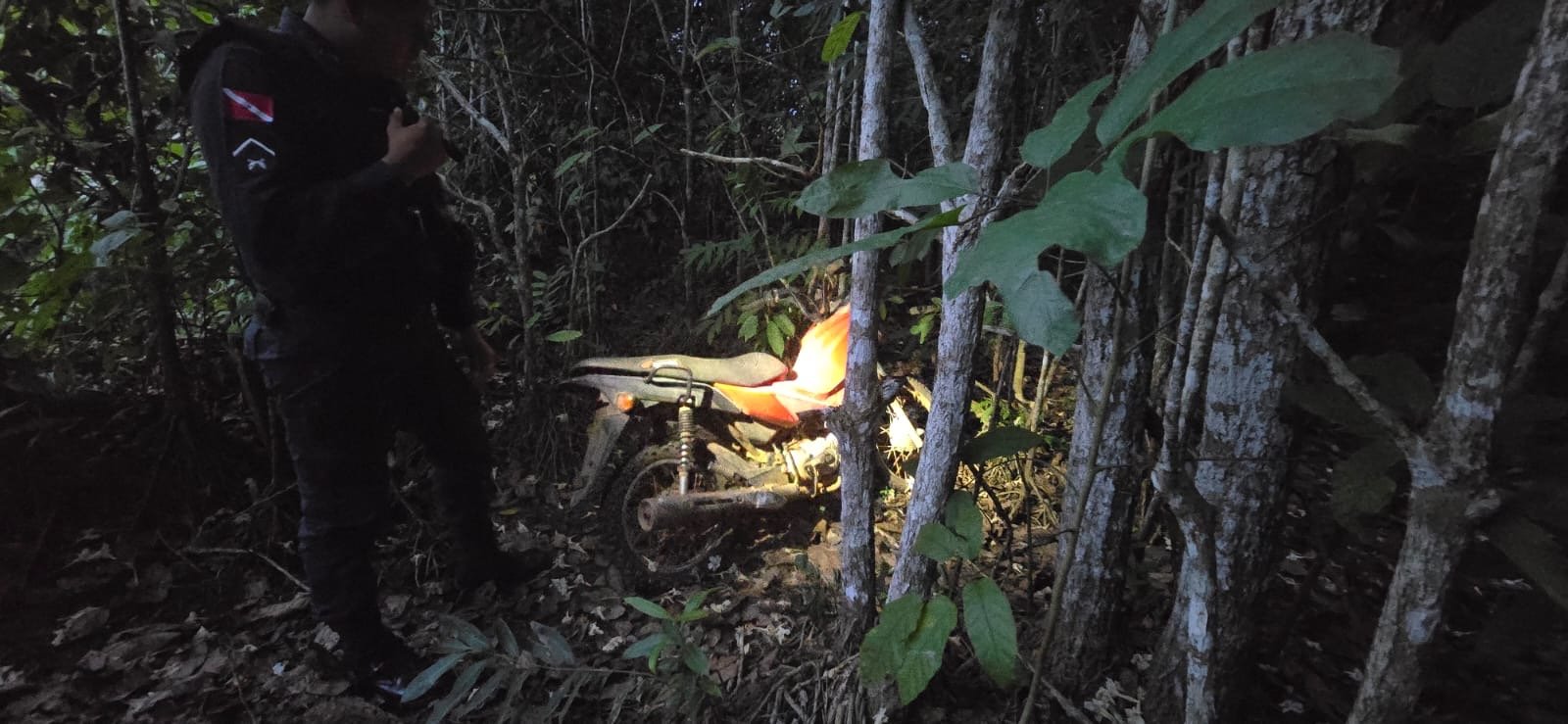 No local, os policiais constataram a veracidade da informação. Tratava-se de uma motocicleta Honda Pop 110, de cor vermelha, que se encontrava escondida em uma área de mata fechada e de difícil acesso, próxima a um trecho alagado às margens de um rio. O veículo apresentava sinais de violação, com a ignição danificada e fios arrancados.