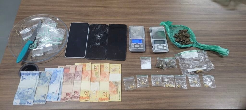 Com a autorização do suspeito, os policiais entraram na residência, onde localizaram uma porção grande e duas pequenas de substância semelhante à maconhaR$ 68,00 em espécieuma porção de crackuma porção de cocaína, além de duas balanças de precisão e diversas embalagens, caracterizando materiais utilizados no preparo e na comercialização de drogas.