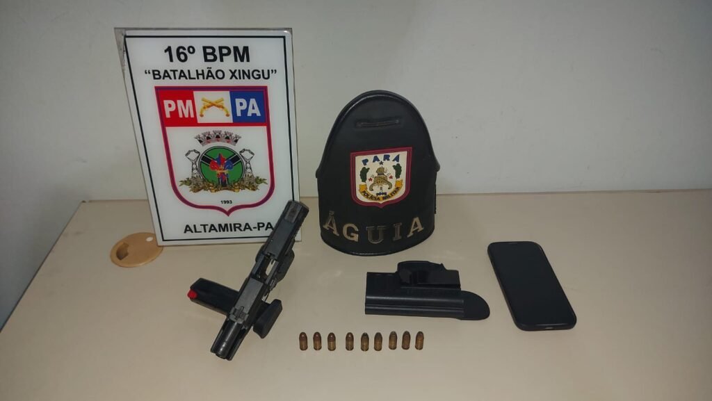 Com autorização do proprietário da balsa, os policiais realizaram buscas no interior da embarcação e localizaram uma pistola Taurus PT638 PRO SA, calibre .380, de cor preta, carregada com nove munições intactas.