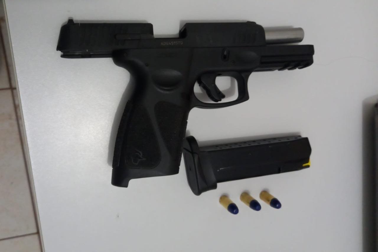 Pistola de marca Taurus foi apreendida e encaminhada à Delegacia de Polícia Civil do município.