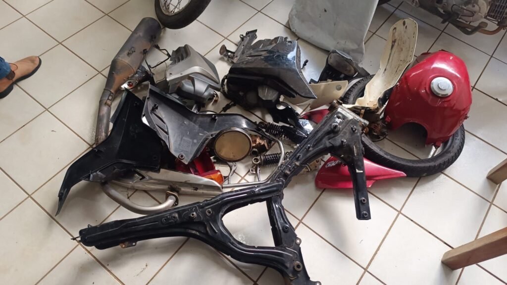 Conforme o relatório policial, os agentes chegaram a uma residência no bairro Palmares 2, onde funcionava um suposto ponto de desmanche de motos. No local, os militares apreenderam diversas peças sem procedência e localizaram um menor de idade, conhecido como “Gordinho”, que confessou participação em um furto recente amplamente divulgado nas redes sociais.