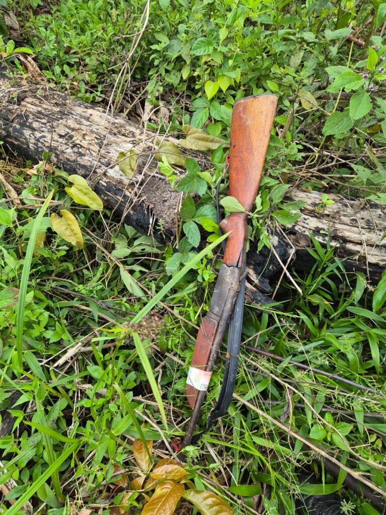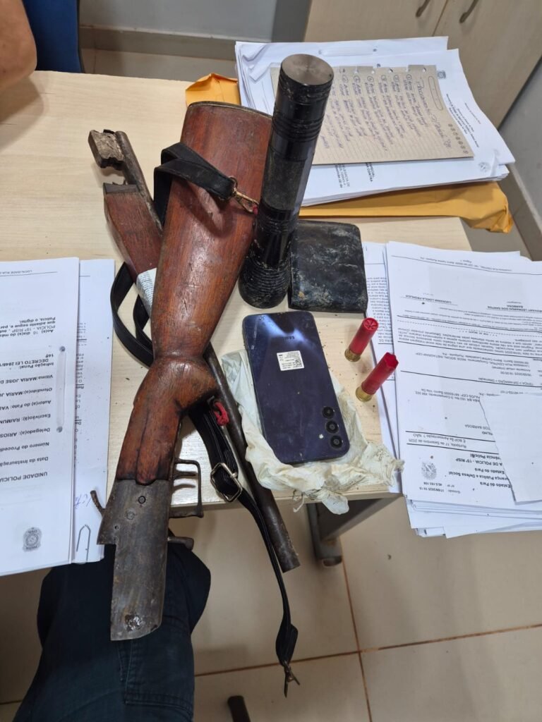 Na residência de um dos citados, os policiais localizaram e apreenderam uma espingarda calibre 20, munições, um aparelho celular, uma lanterna e documentos pertencentes à vítima, além de parte dos objetos subtraídos, que estavam enterrados nas proximidades do imóvel.