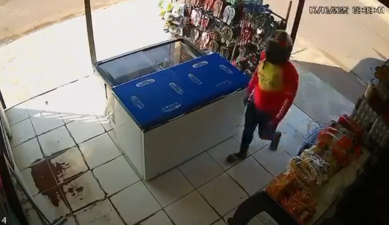 As imagens das câmeras de segurança mostram o suspeito chegando em uma motocicleta, usando uma camisa de empresa de aplicativo. A ação durou menos de dois minutos. Após o roubo, o homem fugiu com a arma em punho, guardando-a na cintura antes de sair do local.