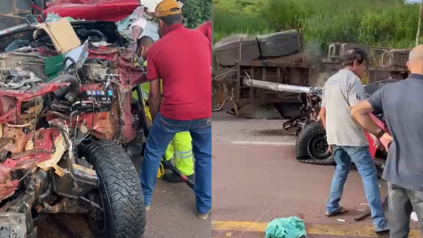 De acordo com as primeiras informações, a carreta teria tombado sobre a caminhonete, que estava carregada, provocando uma cena de grande destruição e mobilizando equipes de resgate.