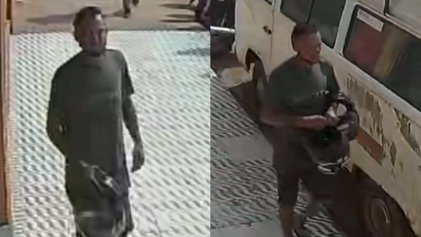 Nas imagens, é possível ver o suspeito — moreno, usando roupa escura e sandálias — nas proximidades da Câmara Municipal. Ele aparece segurando um capacete, e logo em seguida se dirige até a frente de uma Kombi, de onde pega outro capacete e sai caminhando em direção à Igreja Matriz.