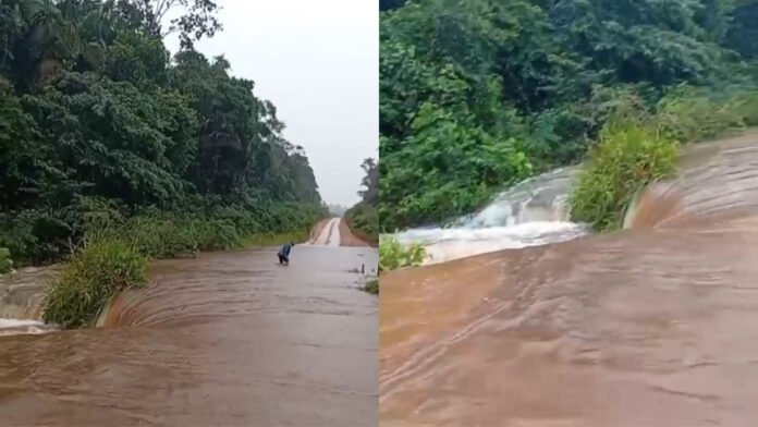 Na manhã de hoje, condutores registraram o igarapé Oriundo transbordando sobre a pista, no km 80 da rodovia. A força da correnteza chama a atenção e representa risco para quem precisa passar pelo local.