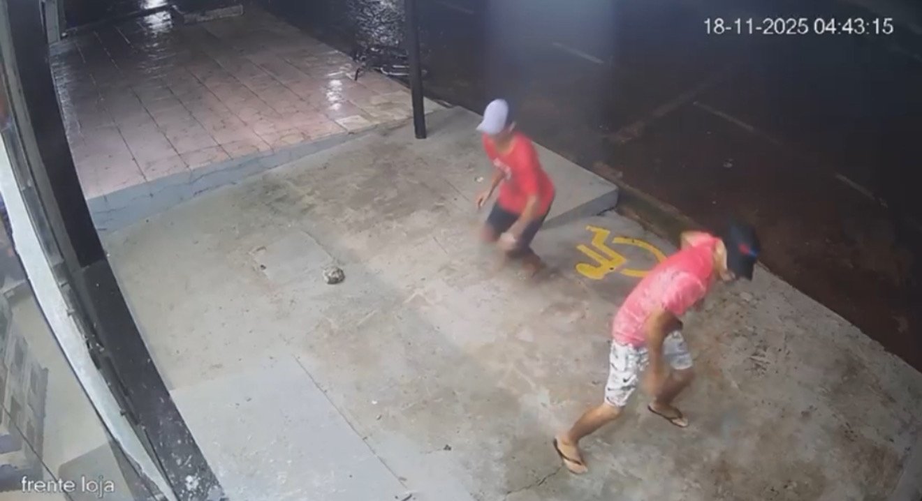 A ação ocorreu na Travessa 15 de Agosto, no centro comercial da cidade, próximo ao Detran. No momento do crime, chovia, e as imagens mostram quando dois indivíduos chegam ao local em uma bicicleta. O primeiro, de porte magro, pele morena, vestindo chinelo, bermuda jeans, camisa vermelha e boné, arremessa uma pedra contra a vidraça da loja, quebrando-a. Em seguida, o comparsa — também magro, de chinelo, camisa rosa e bermuda — lança outra pedra, abrindo passagem para a dupla entrar no estabelecimento.
