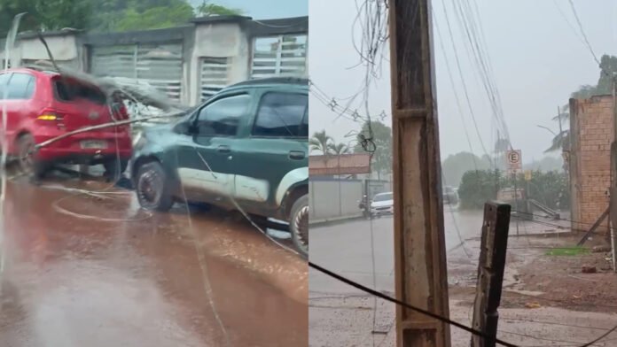 No bairro Nova Miritituba, outro poste de energia caiu sobre dois veículos que estavam estacionados, ampliando os prejuízos causados pela chuva.